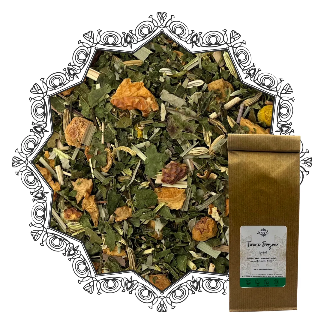 Associée à l’élément Terre, la tisane bonjour bio symbolise le réconfort et l’ancrage. Elle accompagne les instants où l’on a besoin de se recentrer, de retrouver une base intérieure stable, ou simplement de savourer une tasse douce qui met dans de bonnes dispositions. C’est une infusion “d’accueil” : chaleureuse, équilibrée, et pensée pour prendre soin de soi avec simplicité.