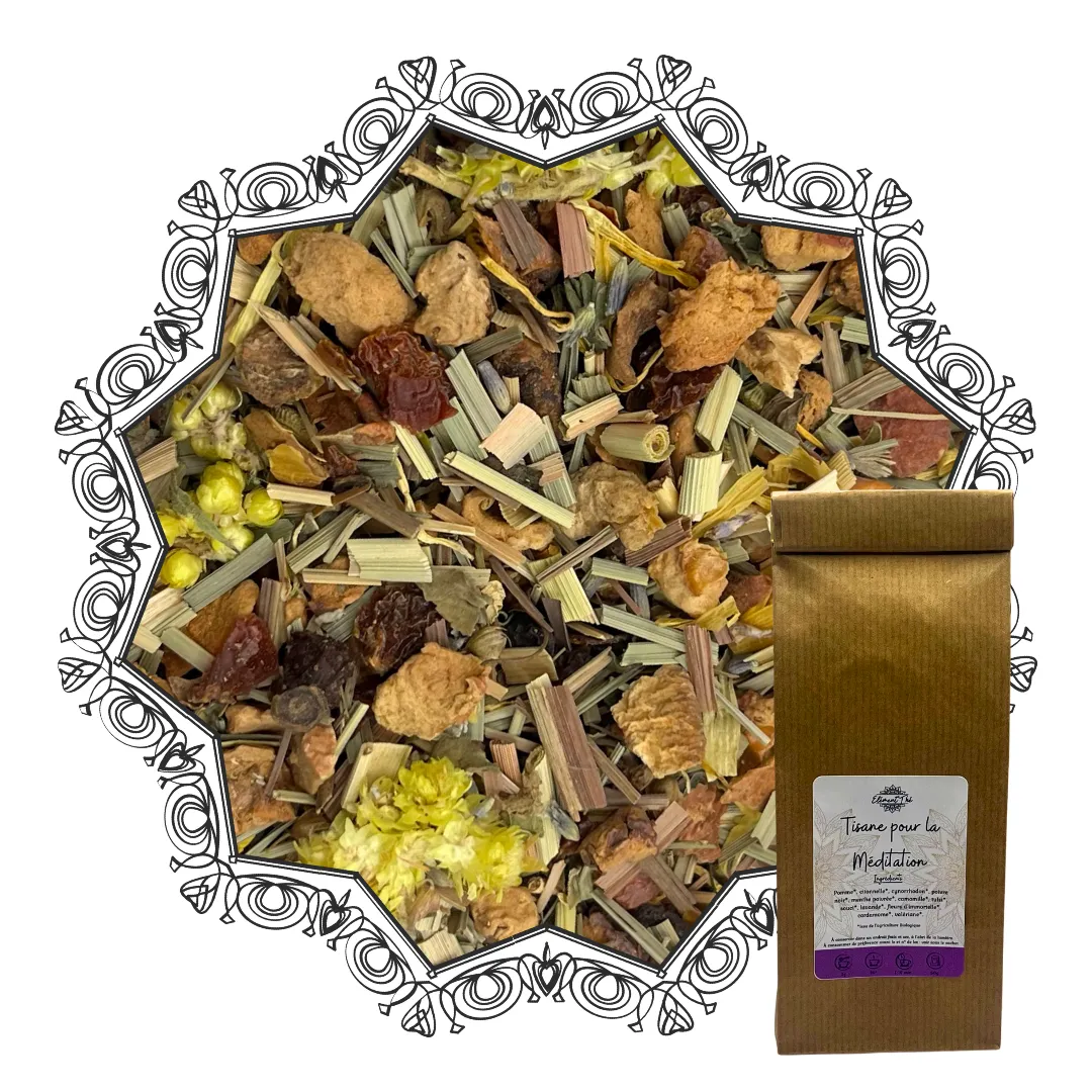 Dans ton univers, l’élément ÉTHER symbolise l’espace, la légèreté et la connexion intérieure. La tisane méditation bio incarne cet ÉTHER en proposant une tasse à la fois stable et aérienne : elle aide à se poser, à clarifier l’esprit, puis à s’ouvrir à une sensation plus subtile de bien-être. Elle accompagne les moments de méditation, les rituels du soir, ou toute pause où l’on cherche une infusion apaisante, harmonieuse et enveloppante.